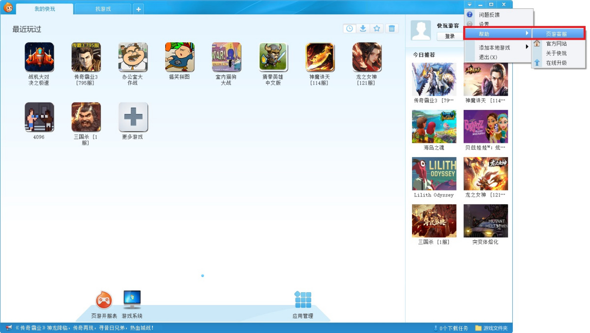 步骤1、打开快玩游戏盒客户端,点击右上角【程序菜单】,选择【帮助】-【页游客服】