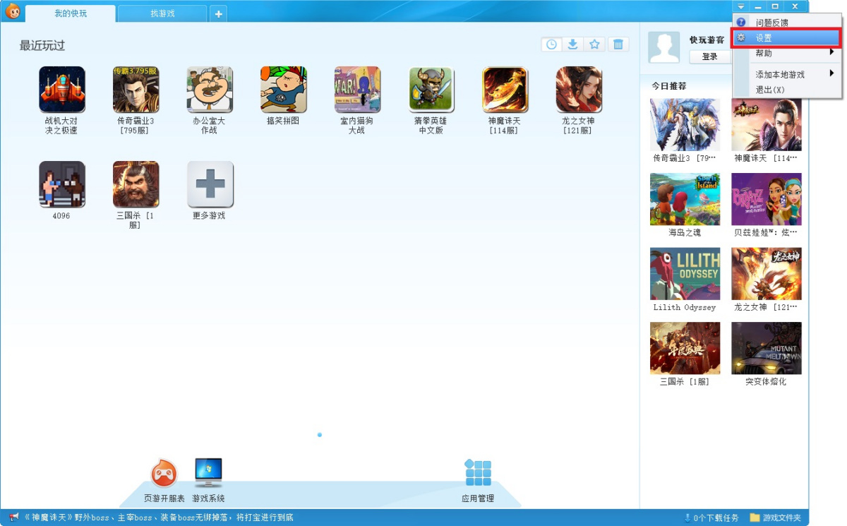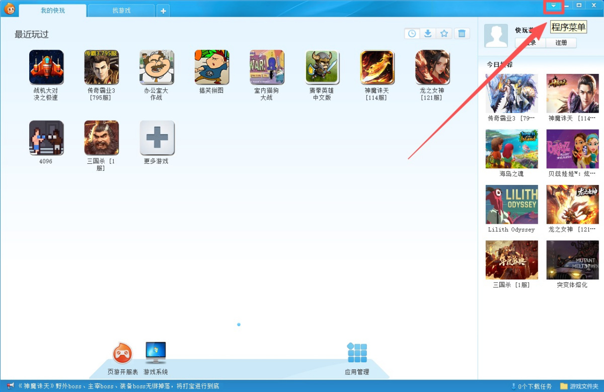步骤1、打开快玩游戏盒客户端,点击右上角【程序菜单】