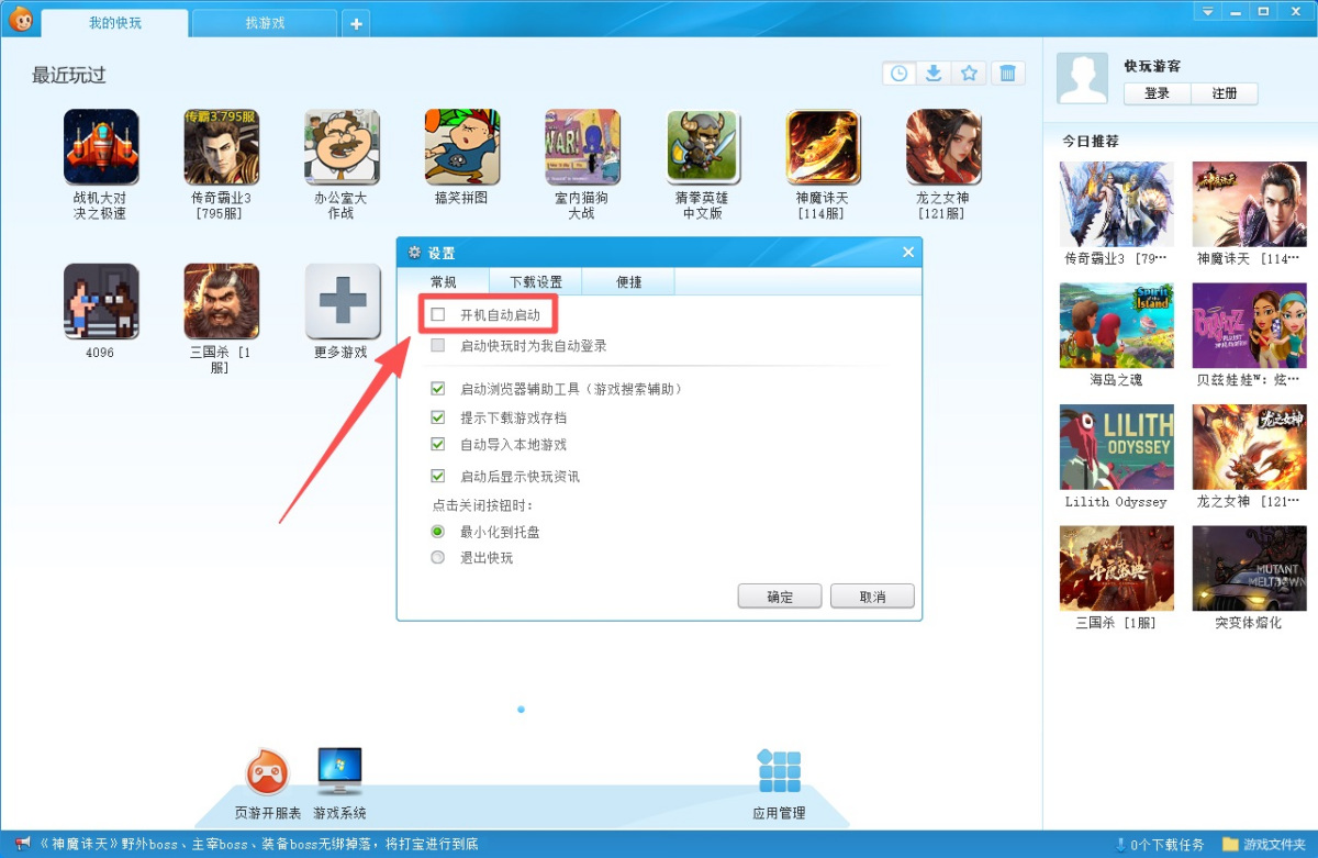 如何关闭快玩游戏盒的开机自动启动