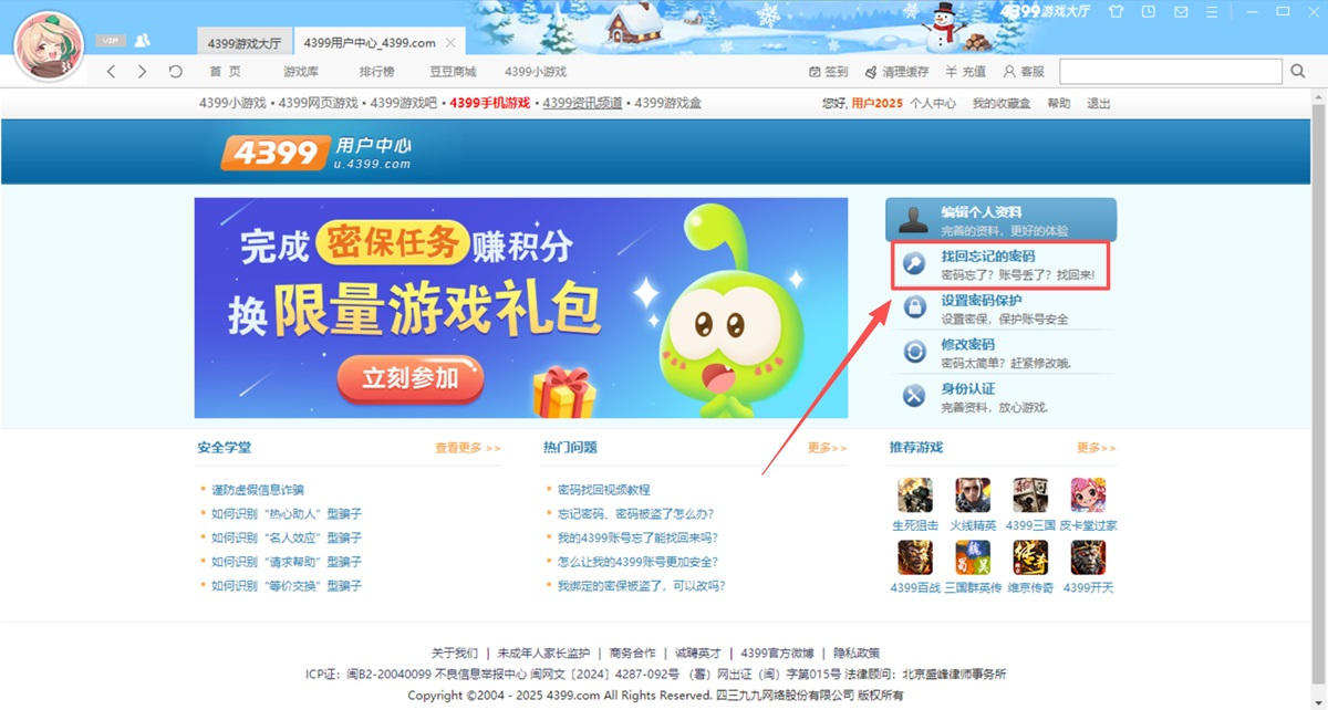 步骤3、跳转到用户中心主界面,点击右侧【找回忘记的密码】