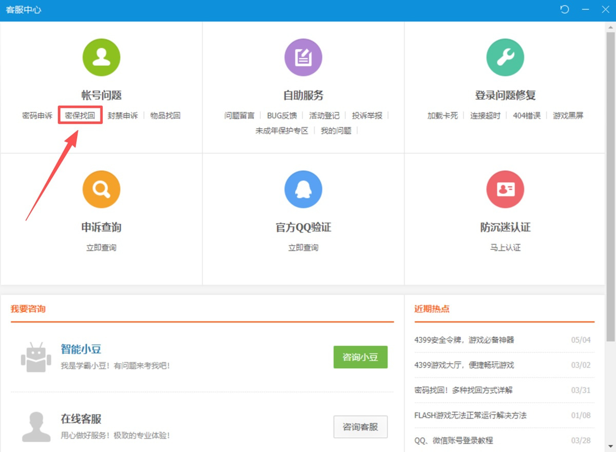 步骤2、进入客服中心后,点击如图所示位置的【密保找回】