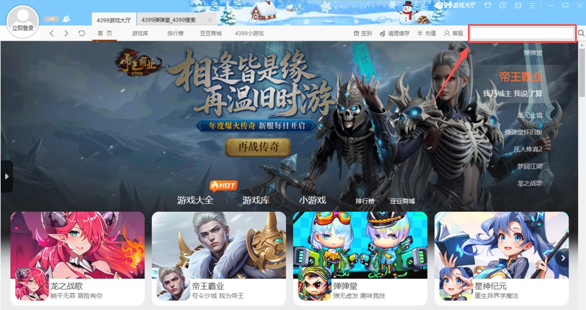 步骤1.打开4399客户端,点击右上角搜索框搜索【弹弹堂】