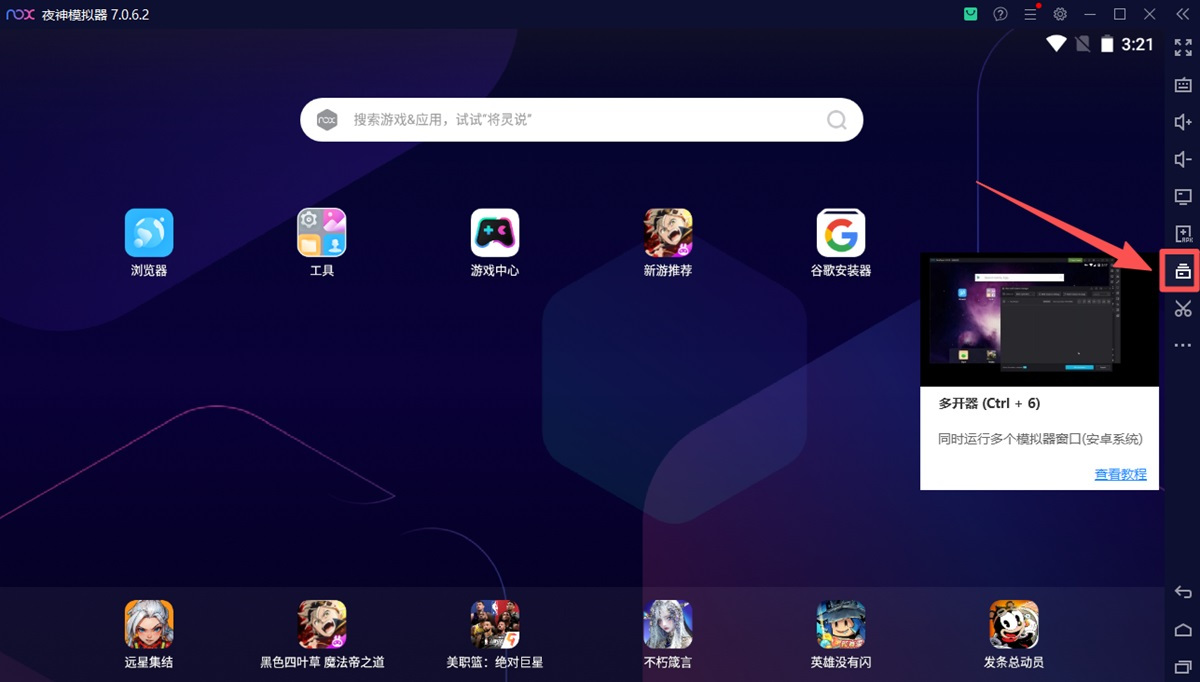 步骤1、启动夜神模拟器,在模拟器的右侧工具栏选择【多开器】并点击打开