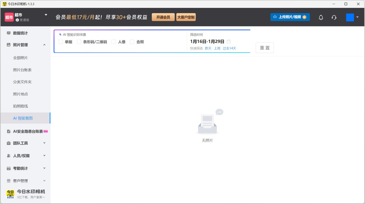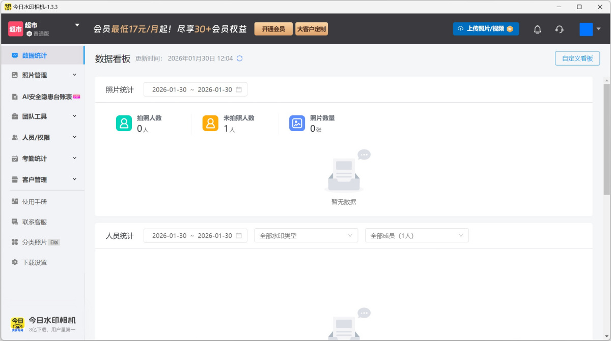 包含照片统计、人员统计和水印统计,可筛选类型和成员,查看数据一目了然。