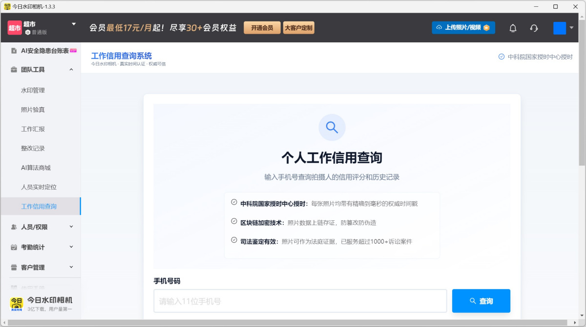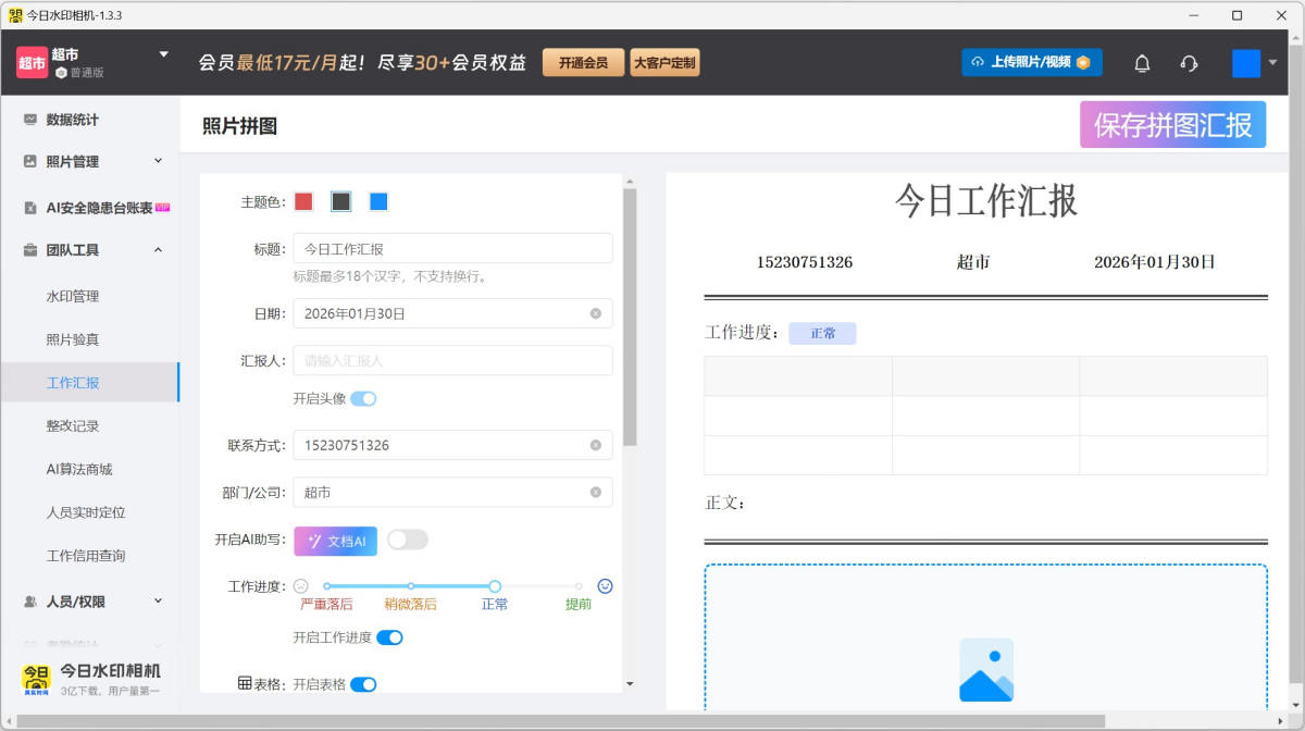 今日水印相机,支持拍照添加真实时间地点水印,防作假破译和篡改。真实记录工作,高效管理团队。拍照自动同步团队工作圈,考勤统计,客户管理,客户拜访,路线规划,功能强大。今日水印相机——建筑工程,物业管理,外勤销售,市政环卫都能用。
