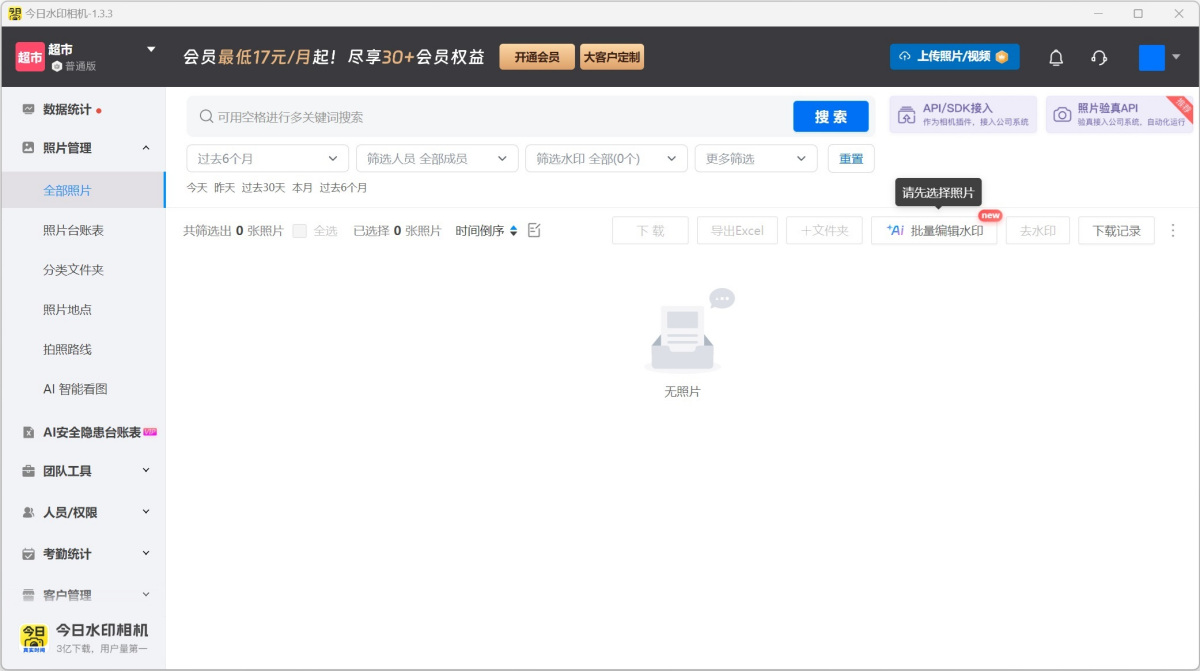 登录电脑后台,进行照片管理、考勤管理、拍照路线、水印管理和团队管理等。