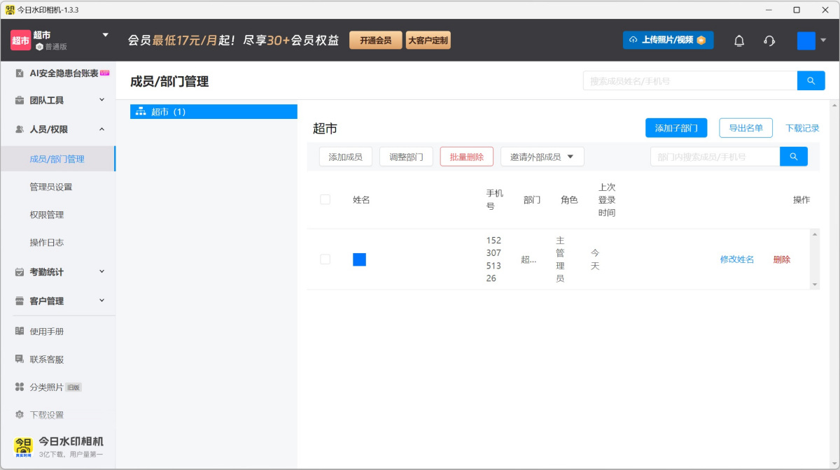 可集中查看与管理部门,支持为单个部门添加成员、调整成员所在部门、批量删除成员的操作,还可以邀请外部成员进入团队。