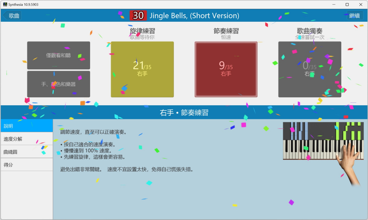 在旋律练习中,Synthesia 会等待你弹奏正确的音符后才继续。