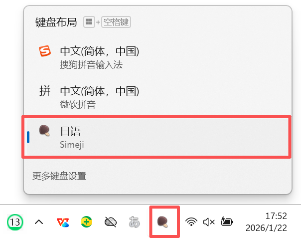 1.点击任务栏右侧的输入法标志,切换到【日语】模式。