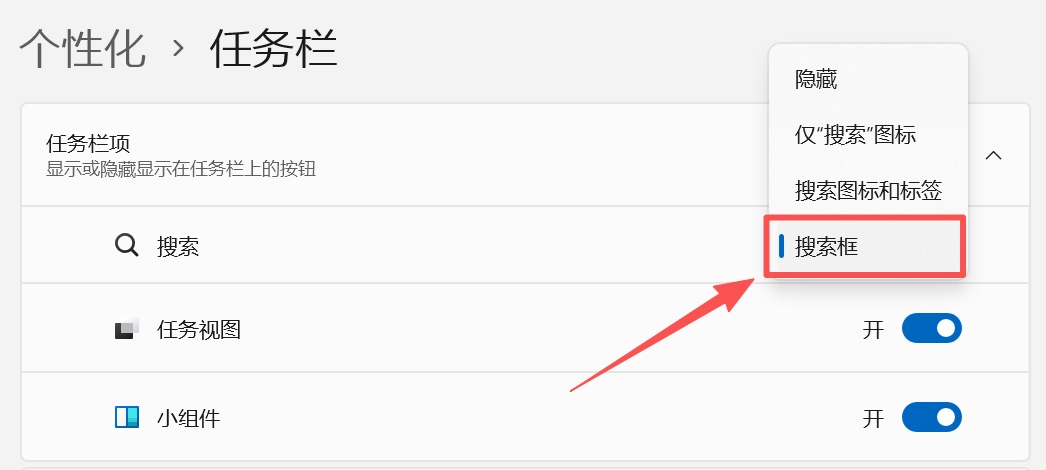 ●在任务栏空白处单击鼠标右键,选择【任务栏设置】,在【搜索】右侧选择【搜索框】即可。