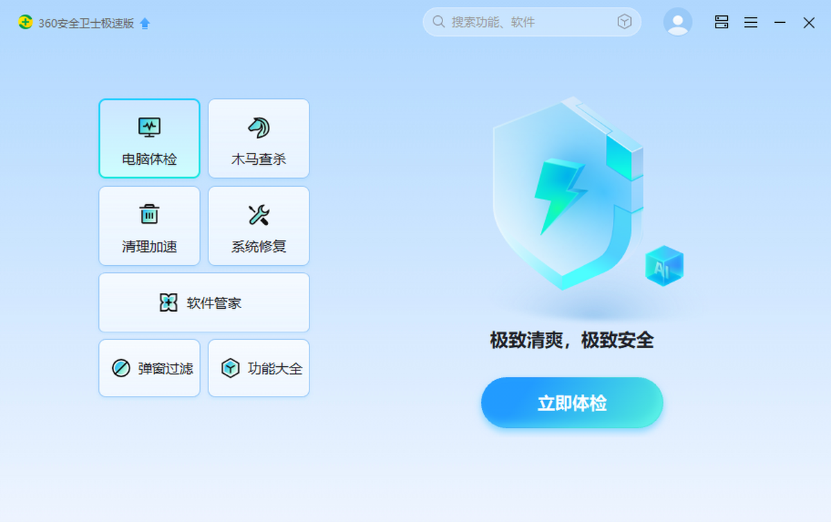 360安全卫士极速版在原有版本的安全防护功能基础上,新增了网络安全、数据安全、安全大脑实时检测,聚焦安全防护能力升级、用户体验升级,以“全面安全”为理念,全方位守护网民的用网安全。在性能上进行了大幅提升,还在设计上化繁为简,全新的“人工智能蓝”UI,在用户体验的升级方面,主打永久免费,无弹窗广告。
