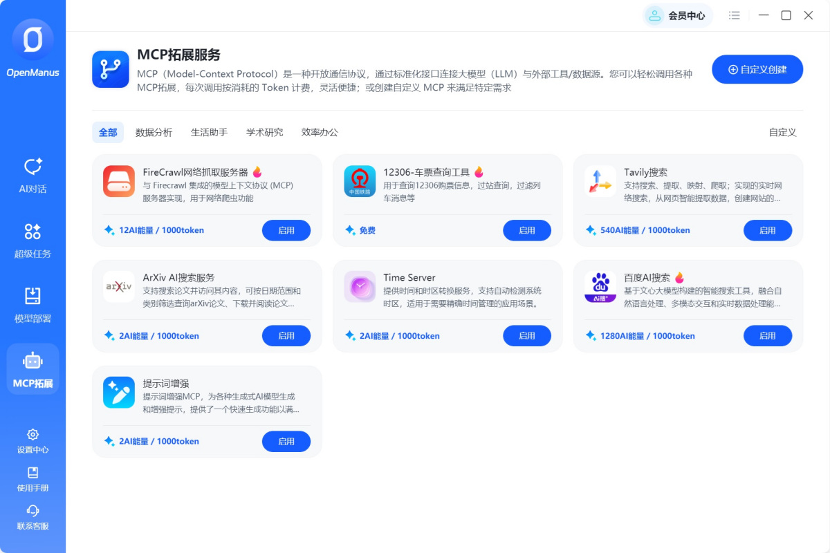 点击启用MCP拓展服务,辅助AI对话输出的内容更加贴合您的垂直化场景需求。支持文件处理、数据库查询、API调用等功能拓展。一键添加官方服务包,或自定义开发专属MCP服务无限扩展AI边界。