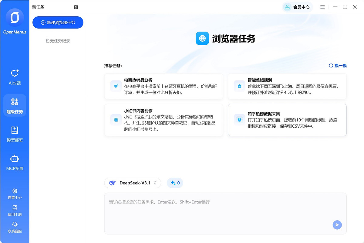 1、智能自动化任务:只需发送指令(如“预定香港迪士尼门票”),即可自动在浏览器中完成操作。实时悬浮窗展示任务进度,任务记录与结果清晰可溯,历史任务轻松管理。