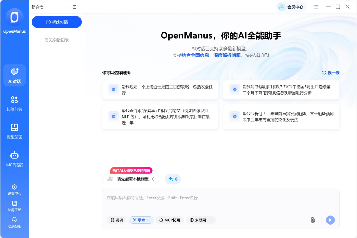 OpenManus 是一款高效便捷的AI任务执行平台,支持一键本地或在线调用模型,保障数据隐私的同时,轻松实现自动化办公、研究分析等复杂任务。您只需输入需求,系统即自动调度工具链,生成专业报告。