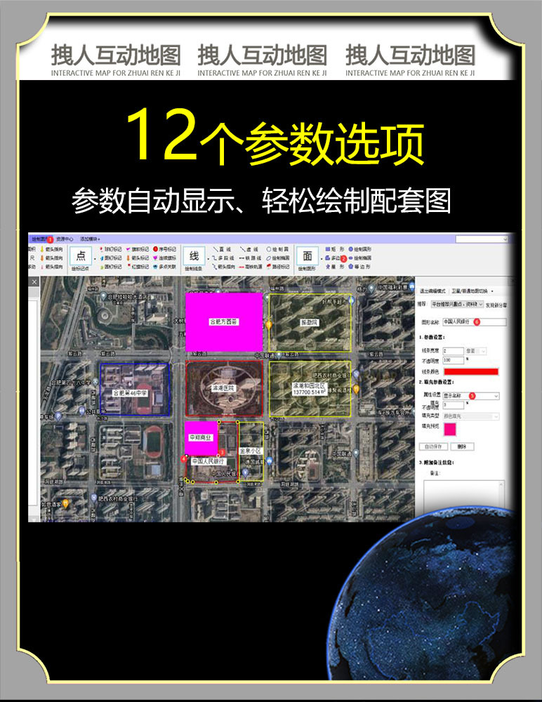 (2)地图绘制功能:包括点编辑、线编辑、面编辑。 其中点标记包括,球钉标记、图钉标记、圆钉标记、旗帜标记、箭头标记、红旗标记、序号标记、连续符号标记、多点关联标记等 其中绘制线条又包括,直线、虚线、园、椭圆、多段线、铁路线、绘制椭圆、绘制箭头指向、绘制高铁线路、路径沿点标记等 其中绘制图形包括矩形,多边形、星形状(如五角星、六角形等)、绘制圆形、绘制椭圆、绘制等边形(墨卡托地图平面像素等边)等
