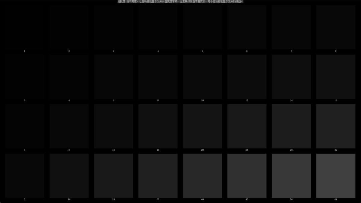 1、对比度:调节亮度,让色块都能显示出来并且亮度不同,注意确保黑色不要变灰,每个色块都能显示出来的好些。