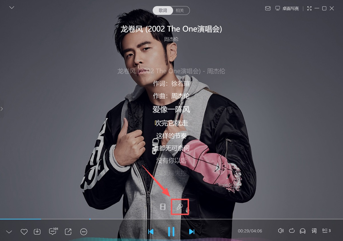 步骤2、在歌词界面,点击歌词下方的【麦克风】图标