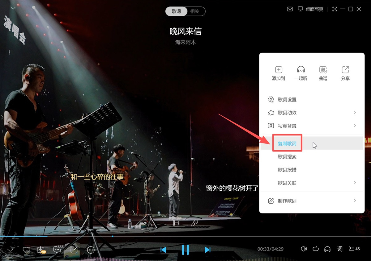 步骤2、在歌词展示页右击,点击【复制歌词】,之后打开一个记事本,就可以把歌词粘贴进去了