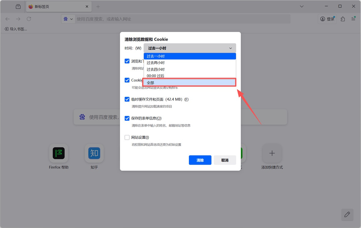 步骤3、在对话框中的时间下拉菜单里,选择【全部】,确保【历史】已被选中,取消勾选所有你不想清除的项目,点击【清除】即可