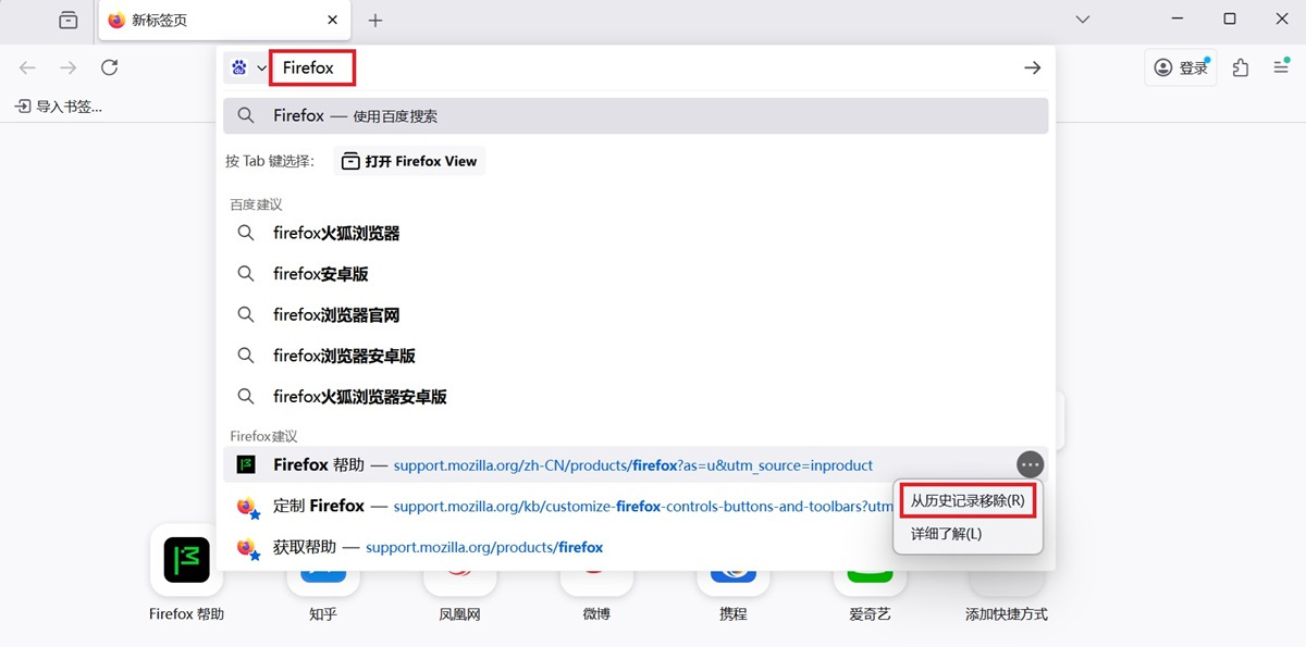 ●单击浏览器搜索输入框,按↓和↑按键来滚动项目列表。选中的要删除项目,按 Shift + Delete 按键即可