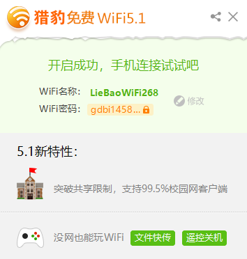 猎豹免费WiFi是一款基于PC无线网卡的免费wifi无线共享的软件。只需要进行一键设置,就可以把笔记本变成无线路由器,手机、平板登等具备无线上网功能的设备就可以轻松实现免费共享上网。此外,猎豹免费WiFi还支持90%以上校园网,首创个性欢迎页,并完美适配市面上所有的随身wif,非常的便捷。