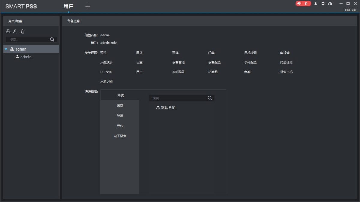 6、用户:添加、删除、修改SmartPSS用户和角色,配置用户和角色的权限。