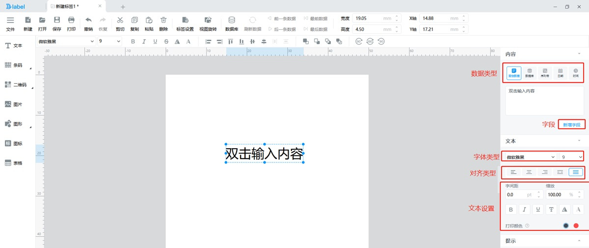 左侧栏,选择需要编辑的类型(文本、条码、二维码、图片、图形、图标和表格)。