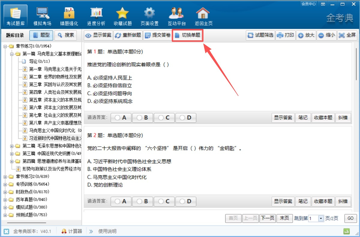 不仅有丰富的题型,还能切换单题、多题模式,筛选题型做题
