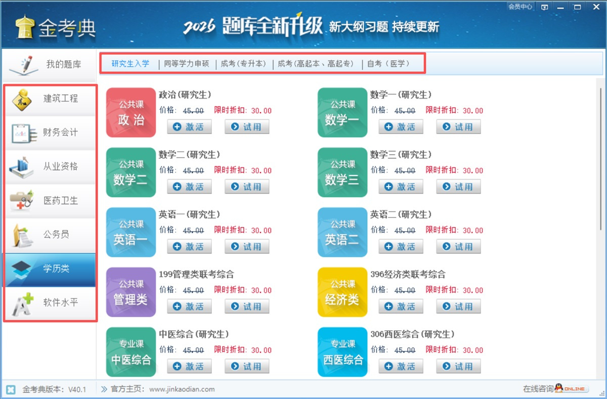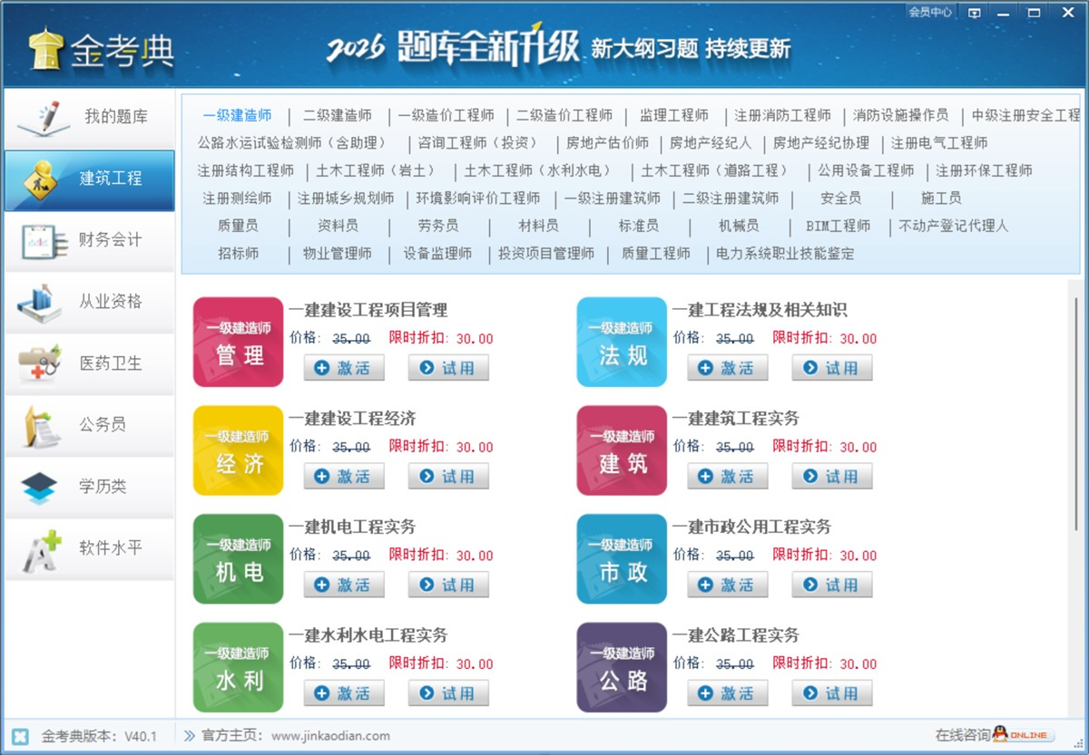 包含建筑工程类,财务会计类,从业资格类,公务员等数百个科目,下载软件都可以在金考典官网免费下载试用,永久免费升级,软件通过主流杀毒软件权威认证,安全可靠。