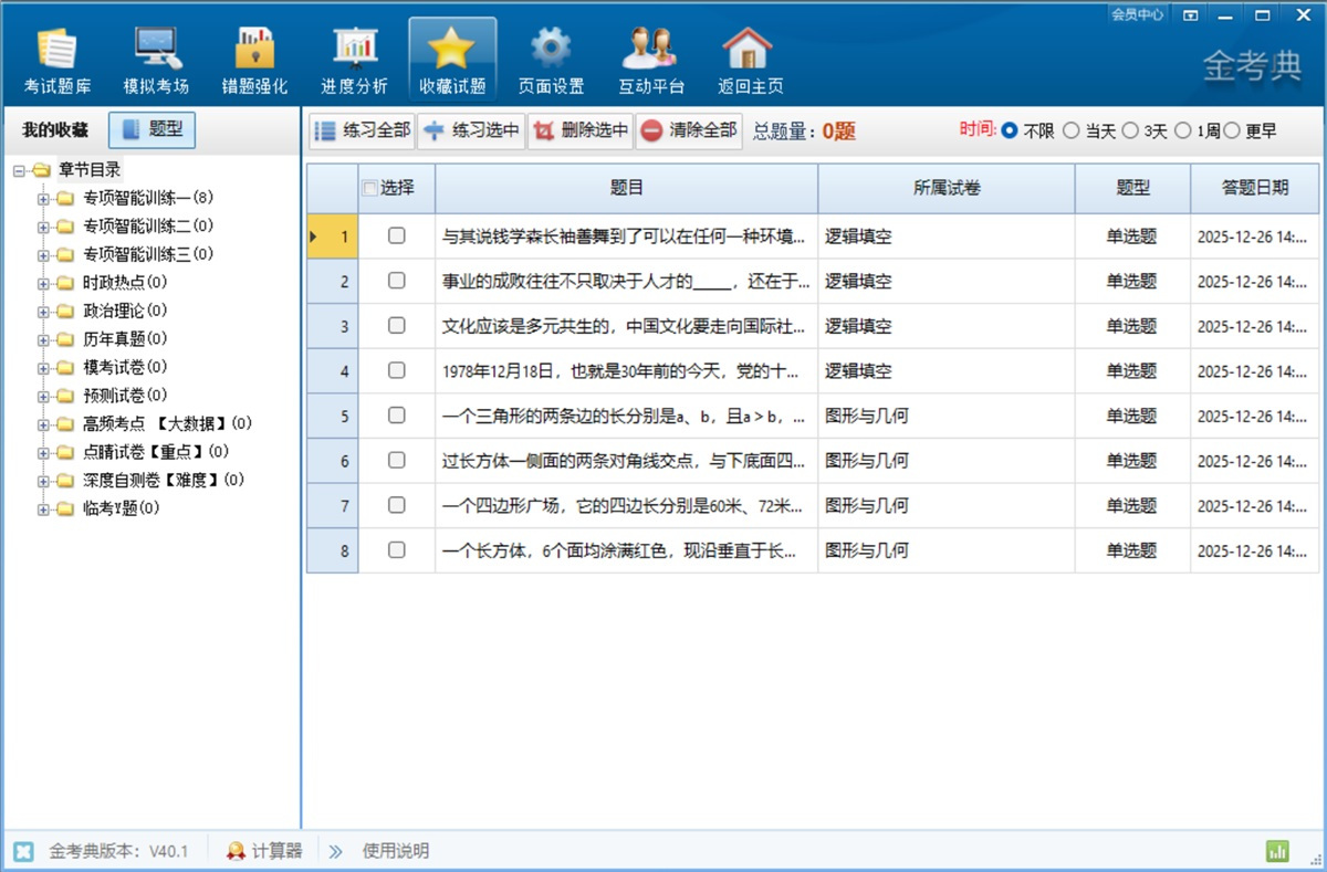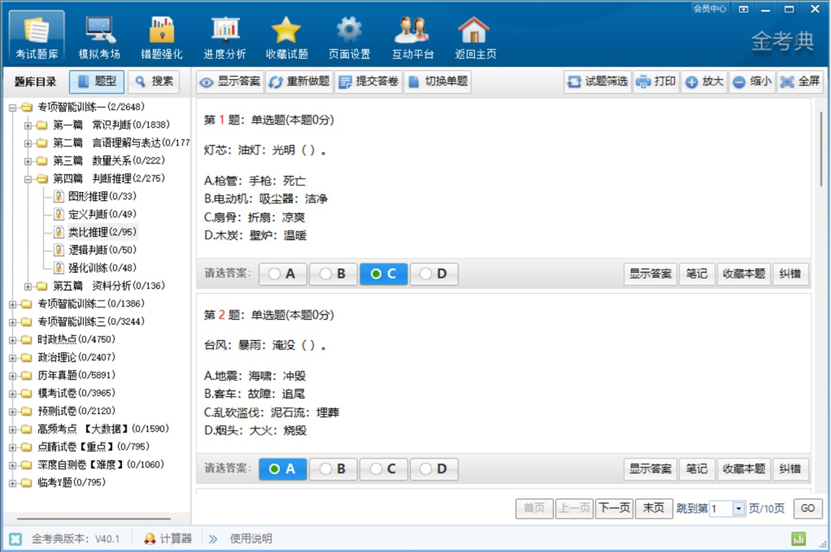 “金考典”的试题分配套章节习题,历年真题、模拟、预测试卷; 试题出自北京的各大教育机构以及各大出版社(个别题目素材源于网络公开渠道,如有侵权,违规请联系删除),经过金考典学术中心的精心编辑与审核 ,同时题库设计符合最新资格考试大纲,试题量也是传统习题集的几倍,基本涵盖了考试所要掌握的知识点。历年真题 是我们软件的特点, 是我们通过各种渠道收集到的历年考试真题,而历年试题在考试中出现的机率是很大的。