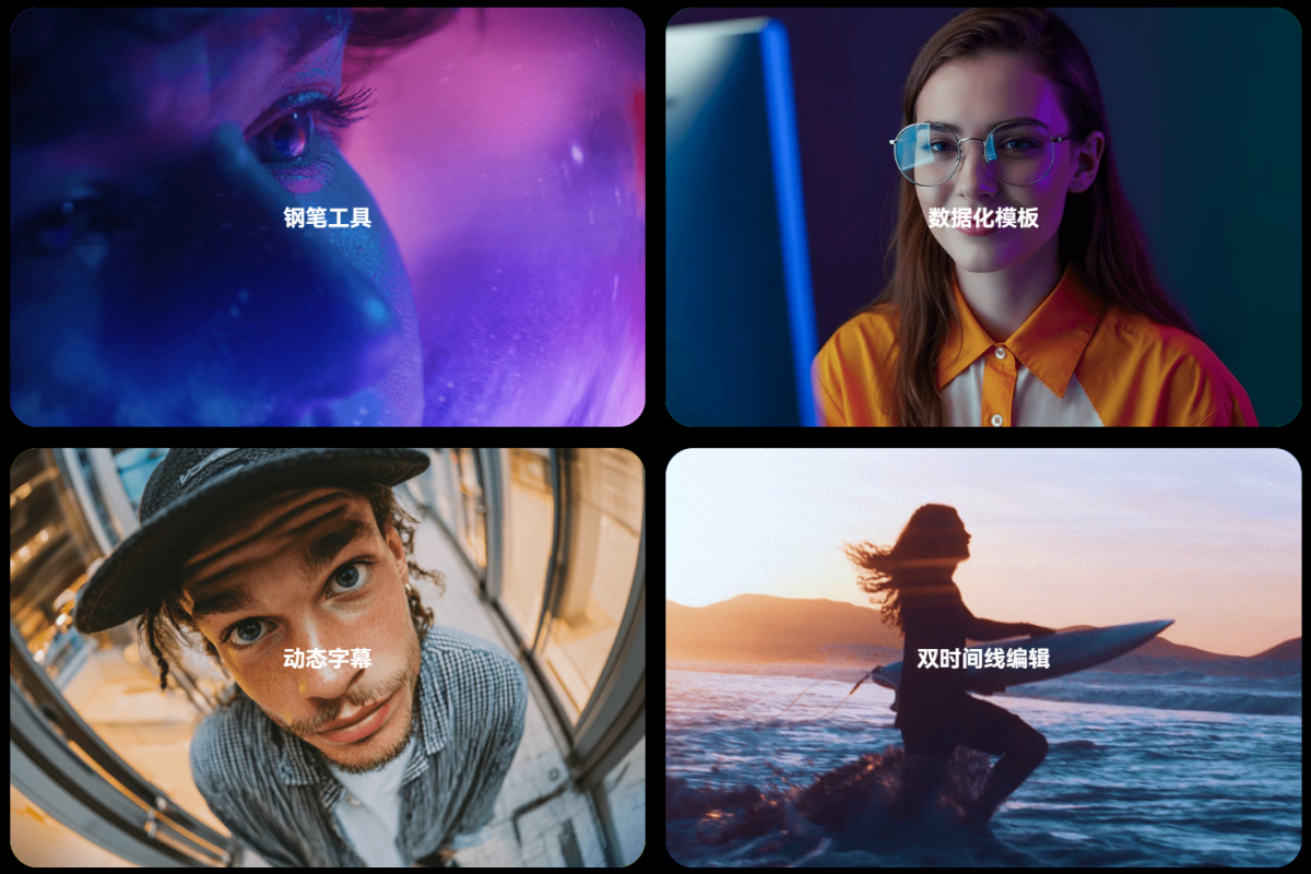 消除闪烁、钢笔工具、多预览窗编辑、数据化模板、平面追踪、多机位剪辑、AI人脸马赛克、图像序列、极致压缩