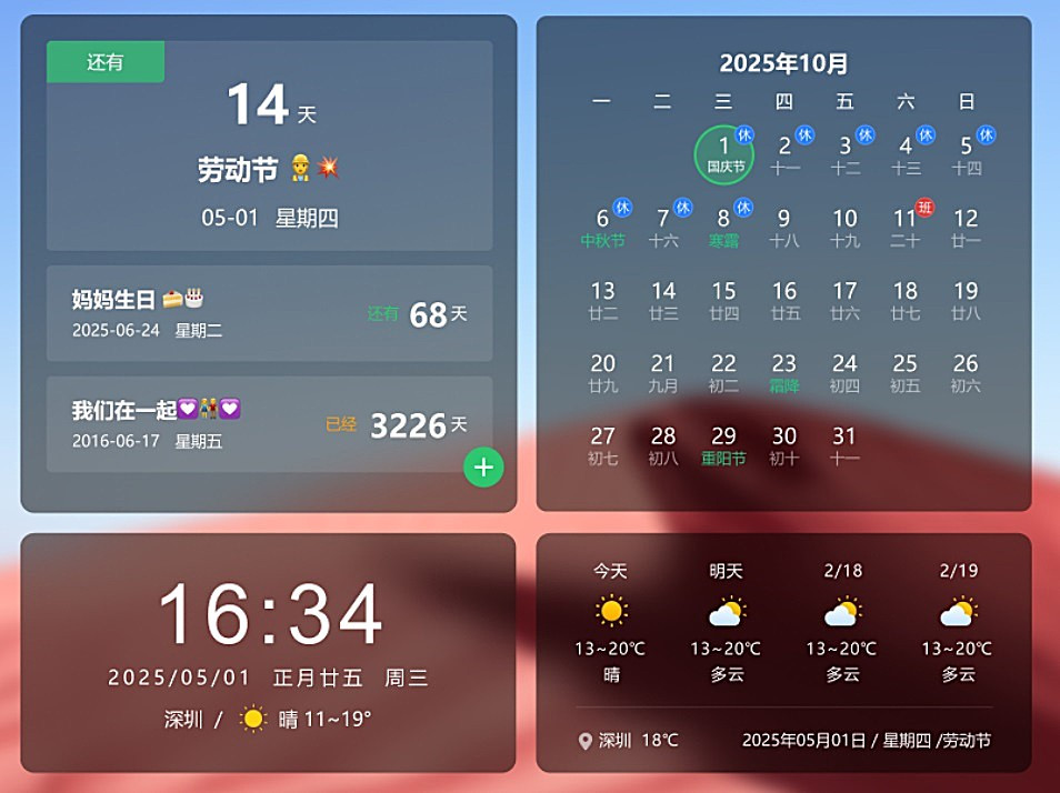●集成倒数纪念日、时间天气等丰富组件