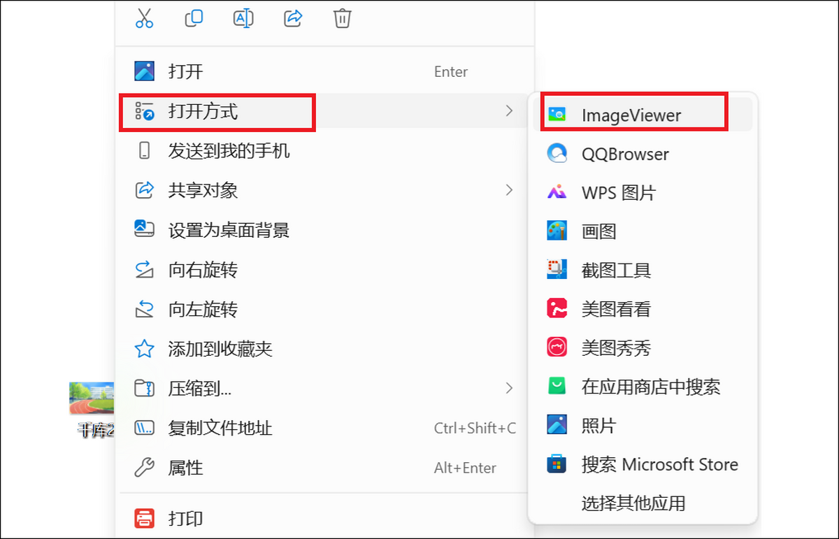 1、鼠标右键图片,选择【打开方式】,点击【ImageViewer】