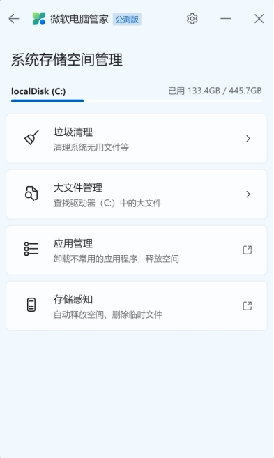在微软电脑管家中选择【系统存储空间管理】即可针对电脑C盘分别进行垃圾清理、大文件管理、应用管理、存储感知。