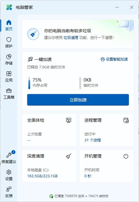 支持电脑体检、病毒查杀、垃圾清理、优化加速