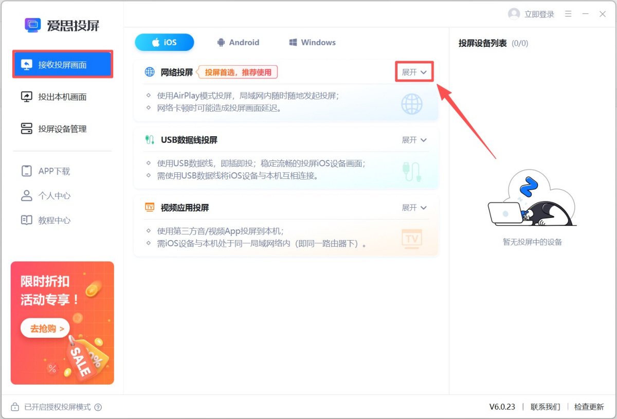 步骤1、打开爱思投屏软件,选择【接收投屏画面】,点击如图所示位置的【展开】